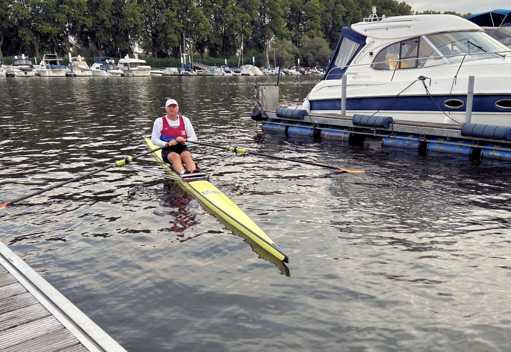 Merkwürdig: Hat sich da ein Ruderer verrudert und versehentlich am Motorbootsteg des WVS angelegt? Nein, er wurde sogar am Steg 1 erwartet. Glücklicherweise waren gerade zwei Motorboote weg, denn so ein Rennruderboot braucht — wie man auf dem Foto sieht — viel Platz.
