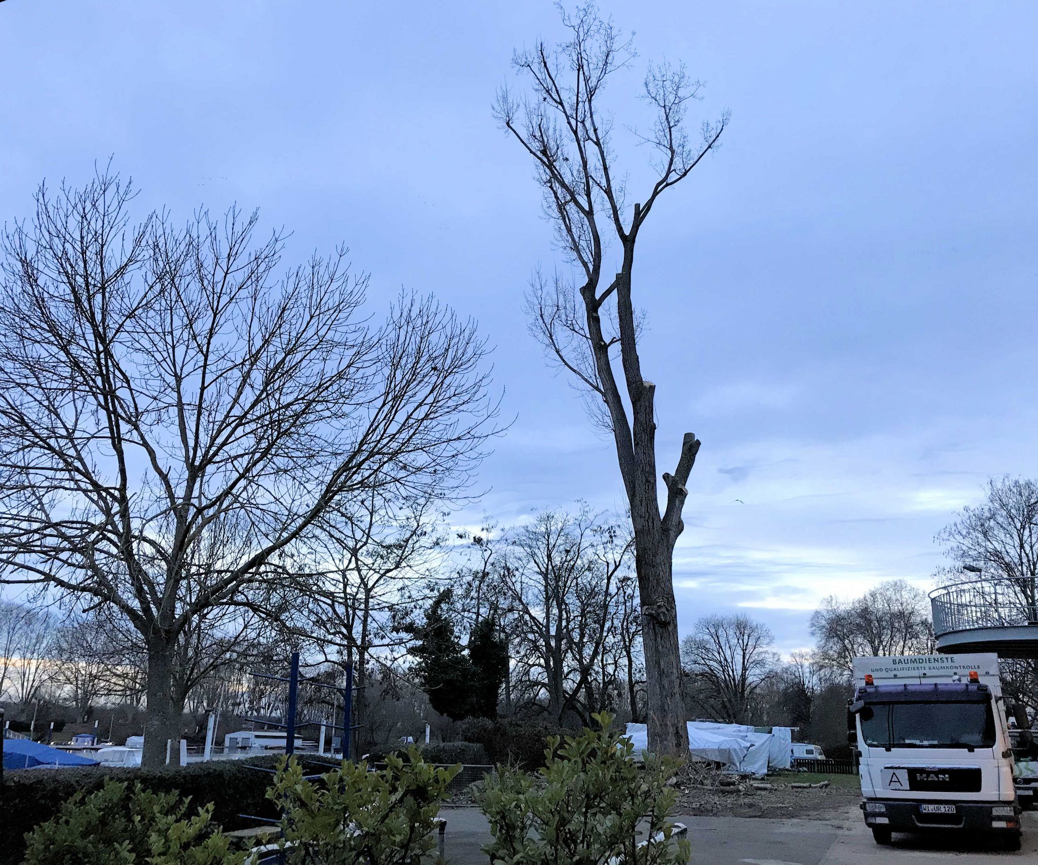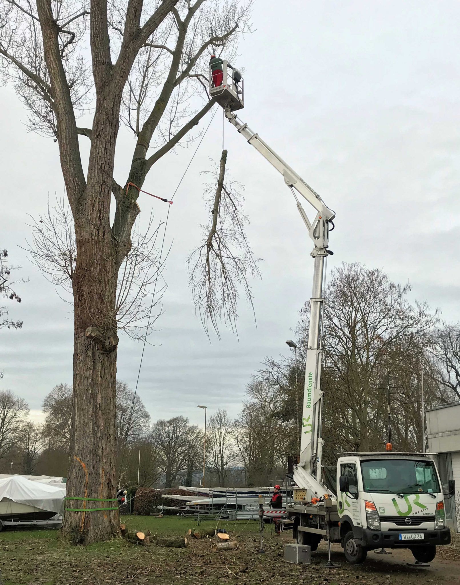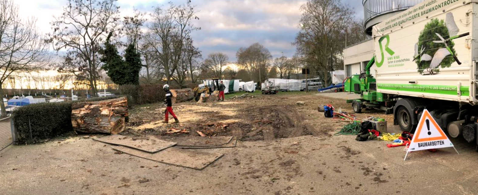 Wie bereits am 4. Dezember hier berichtet (siehe Link), hat das Umweltamt der Landeshauptstadt Wiesbaden eine Fällgenehmigung der großen Pappel auf dem Gelände des Wassersport-Vereins Schierstein 1921 e.V. erteilt. Der WVS-Vorstand hatte daraufhin umgehend die Fällung in Auftrag gegeben und Mitarbeiter der Uwe Ries Garten- & Landschaftsbau GmbH setzten ihn jetzt präzise und sorgsam um. Ast für Ast wurde abgesägt und von der Bodencrew sicher abgeseilt.