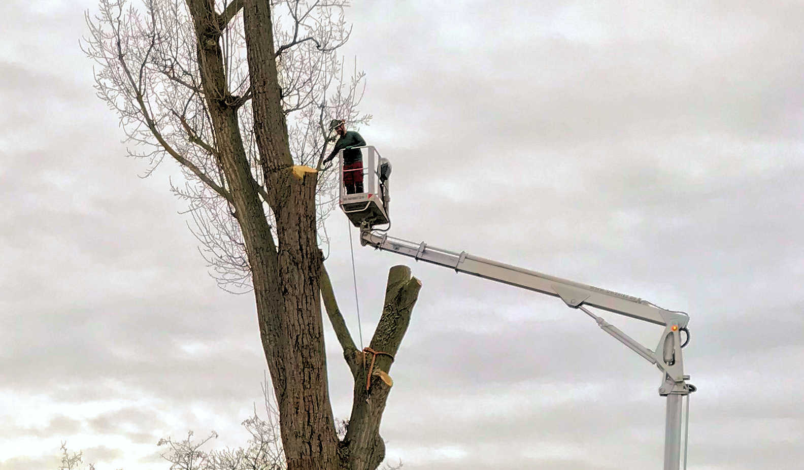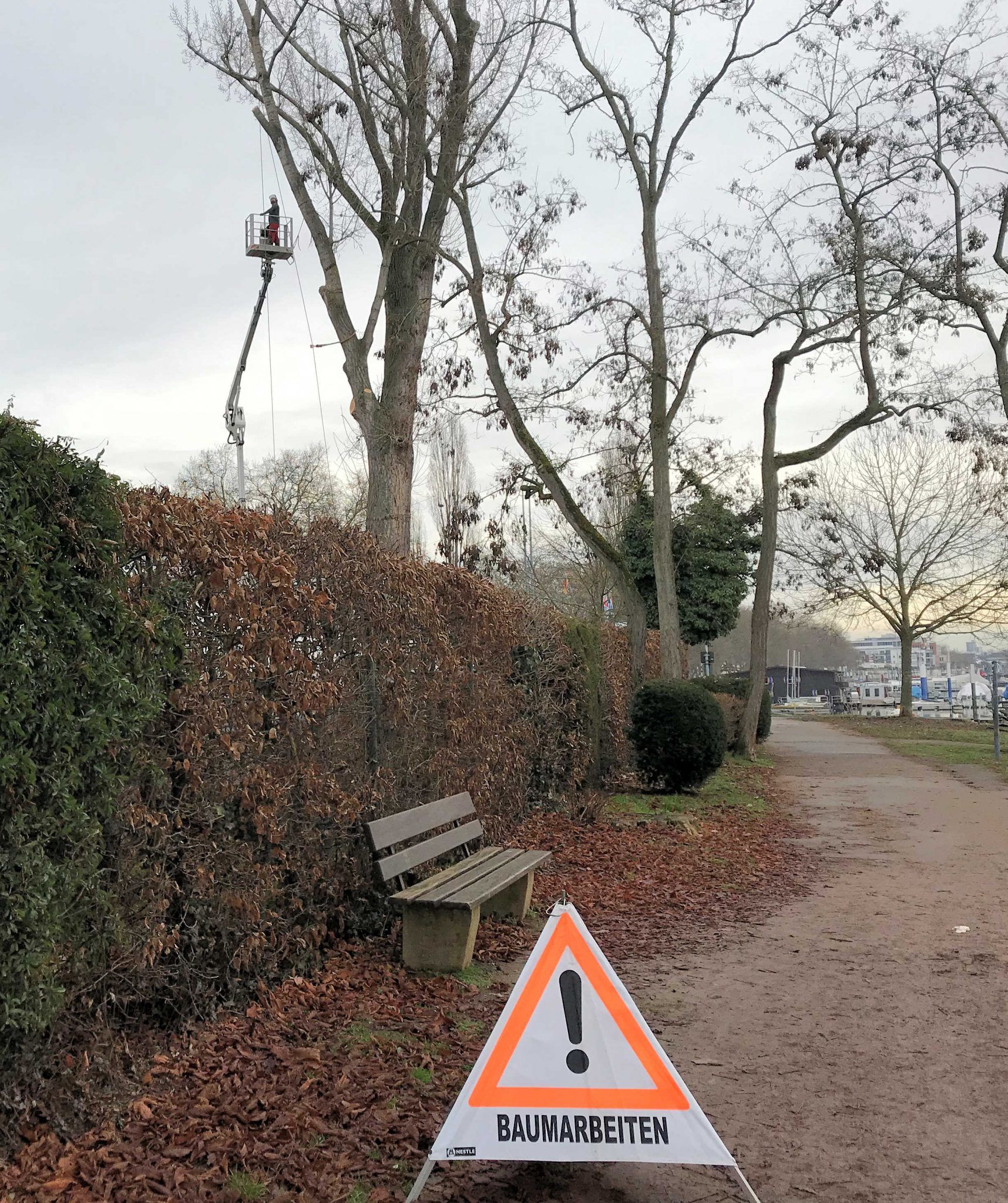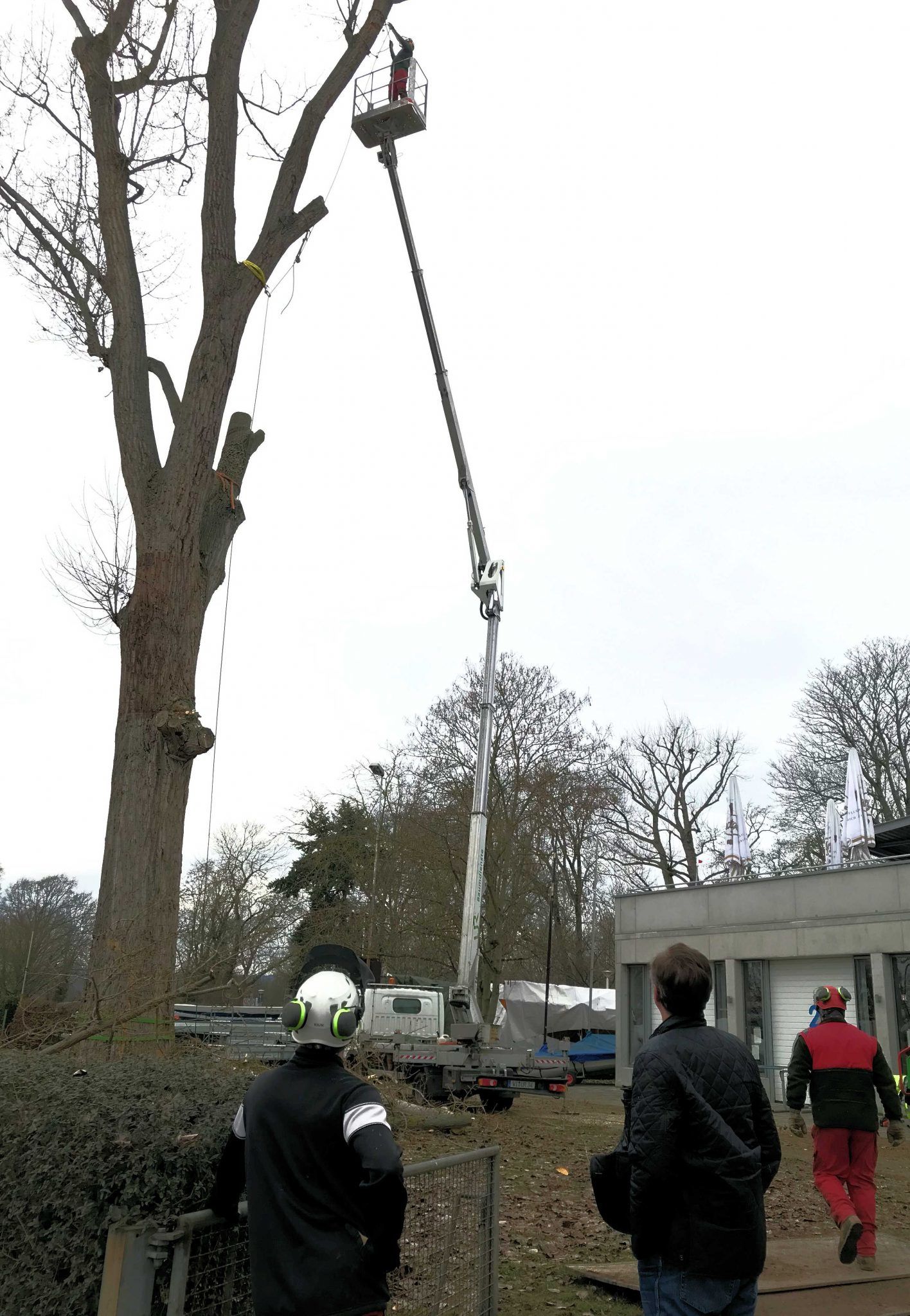 Wie bereits am 4. Dezember hier berichtet (siehe Link), hat das Umweltamt der Landeshauptstadt Wiesbaden eine Fällgenehmigung der großen Pappel auf dem Gelände des Wassersport-Vereins Schierstein 1921 e.V. erteilt. Der WVS-Vorstand hatte daraufhin umgehend die Fällung in Auftrag gegeben und Mitarbeiter der Uwe Ries Garten- & Landschaftsbau GmbH setzten ihn jetzt präzise und sorgsam um. Ast für Ast wurde abgesägt und von der Bodencrew sicher abgeseilt.