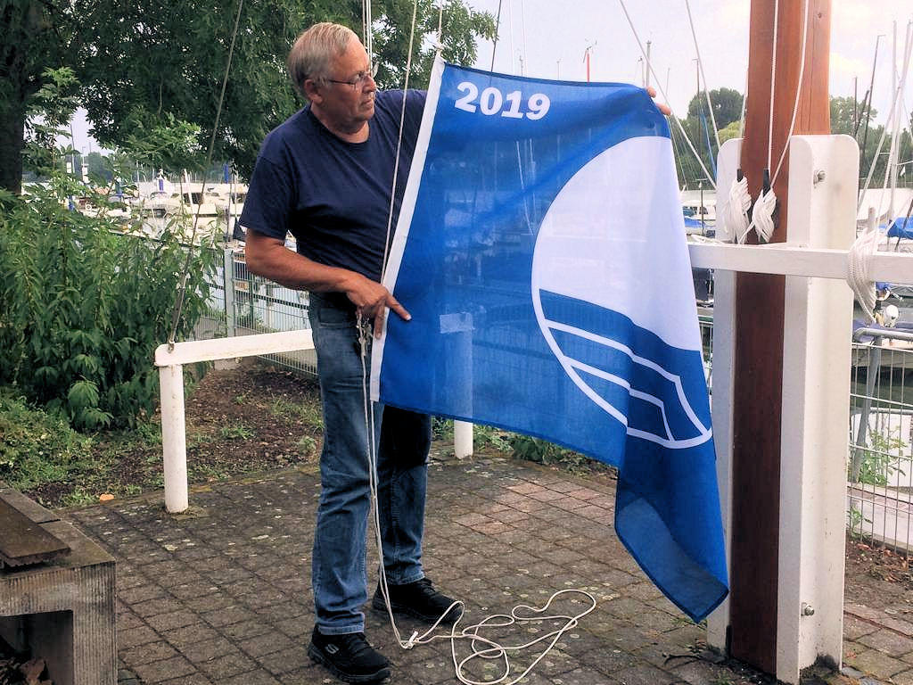 WVS-Vor­stand Fran­jop Schohl hisst die Blaue Flagge 2019 am Vere­ins­mast (Foto: Car­o­line Hartung)