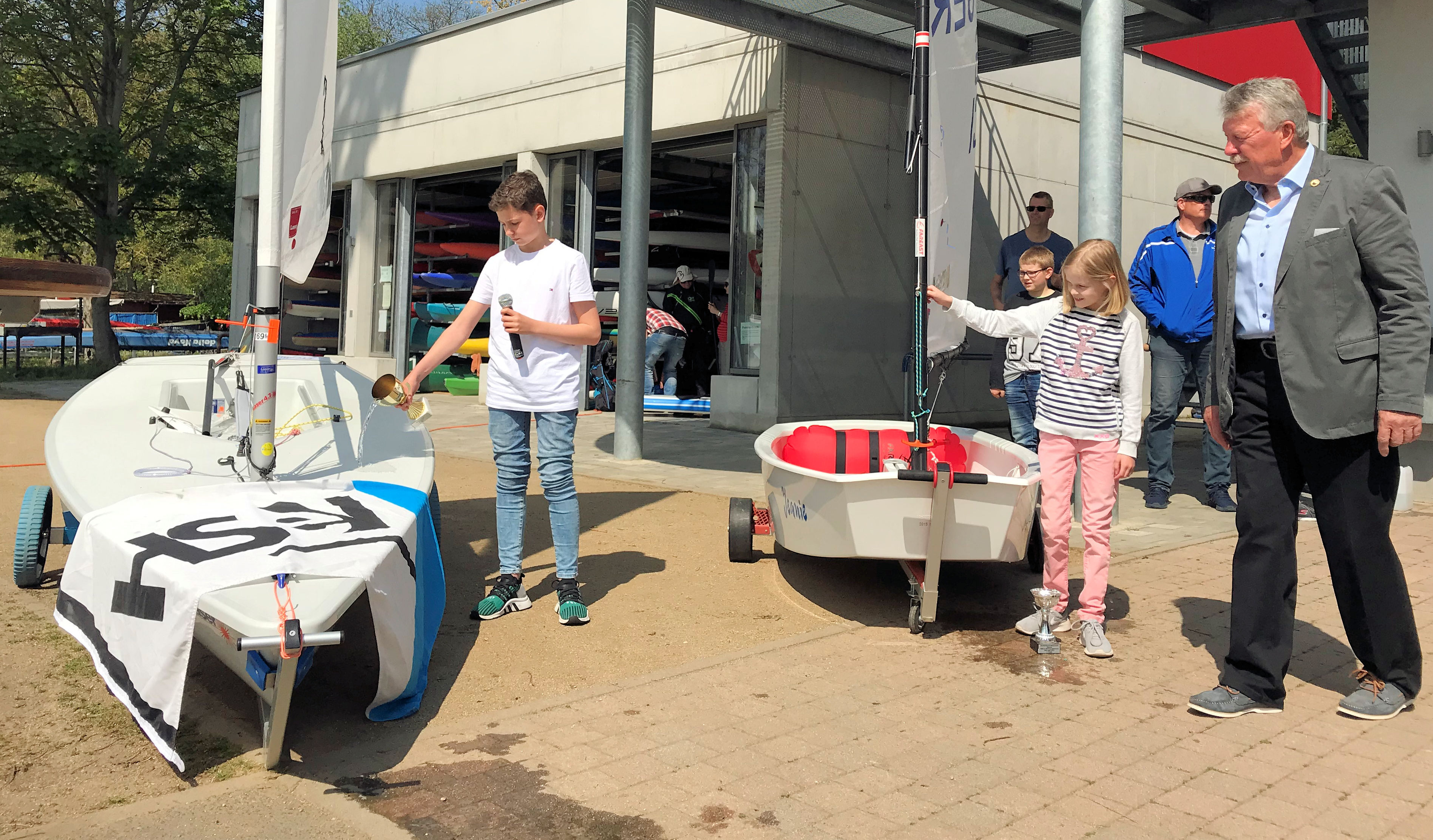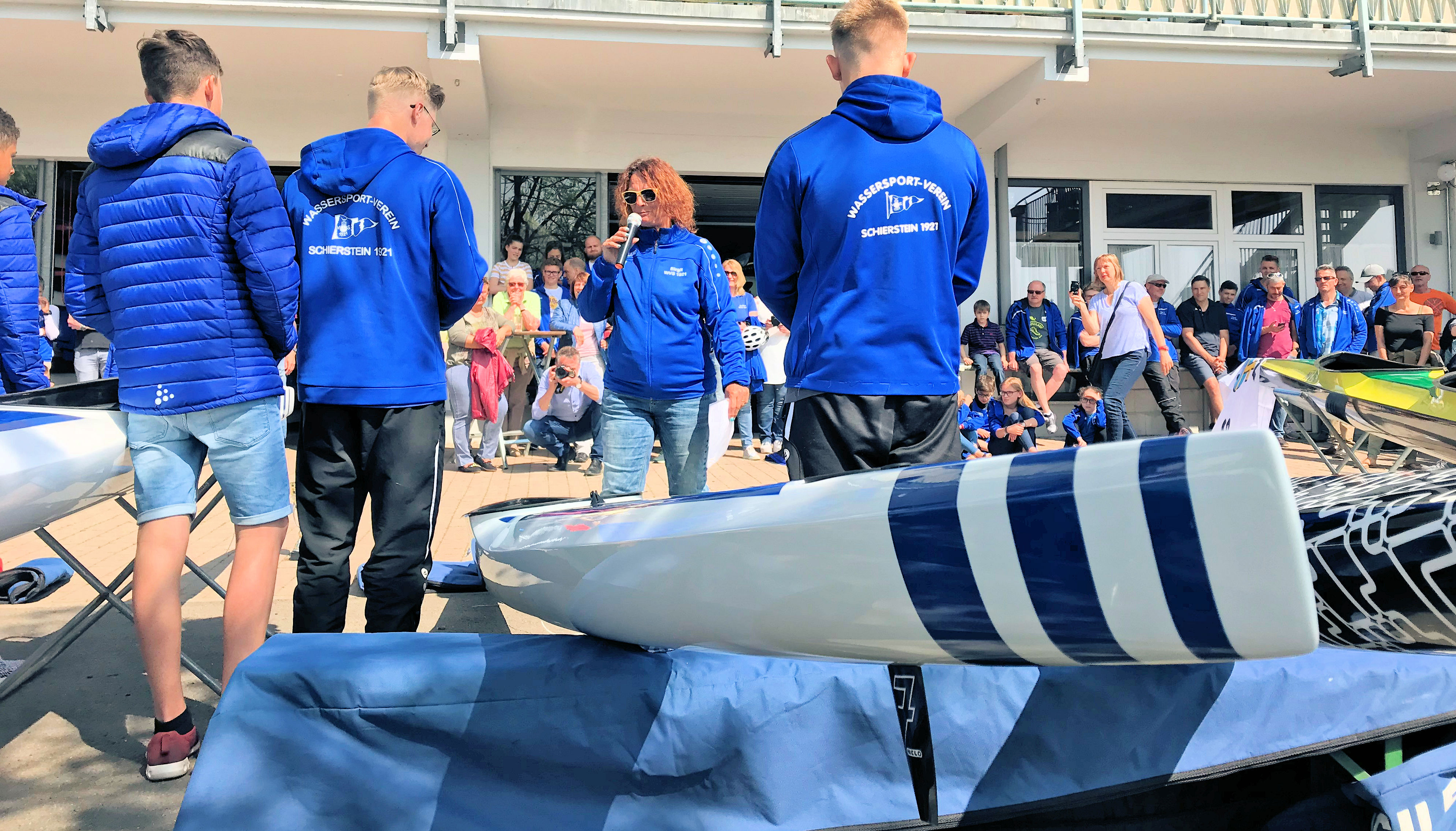 Und dann geht’s los: Lothar Weckerling, der WVS-Präsident, spricht ins Mikrofon und begrüßt Aktive und Gäste. Eigentlich, meint er, sei der Saisonstart nur symbolisch gedacht und die falsche Bezeichnung. Denn im WVS laufe die Saison praktisch das ganze Jahr, die ersten Wettkämpfe des Jahres haben Sportlerinnen und Sportler bereits erfolgreich absolviert. “Um konkurrenzfähig zu bleiben”, betont Weckerling, “müssen wir unseren Sportlerinnen und Sportlern geeignetes Bootsmaterial zur Verfügung stellen. Spezielles Bootsmaterial für Regatten und Boote für den Kinder- und Anfängerbereich, das heißt, für unsere Jugendarbeit, die uns besonders am Herzen liegt. Damit wollen wir die Voraussetzungen für unsere Sportjugend im Verein noch weiter verbessern.” Dazu werden im Anschluss zwei Drachenboote getauft und sieben Rennkajaks: vier 1er, ein 2er und zwei 4er. Ebenfalls getauft werden ein Optimist und eine Jolle — zwei private Boote, wie sie in der Segelausbildung für Kinder und Jugendliche zum Einsatz kommen.