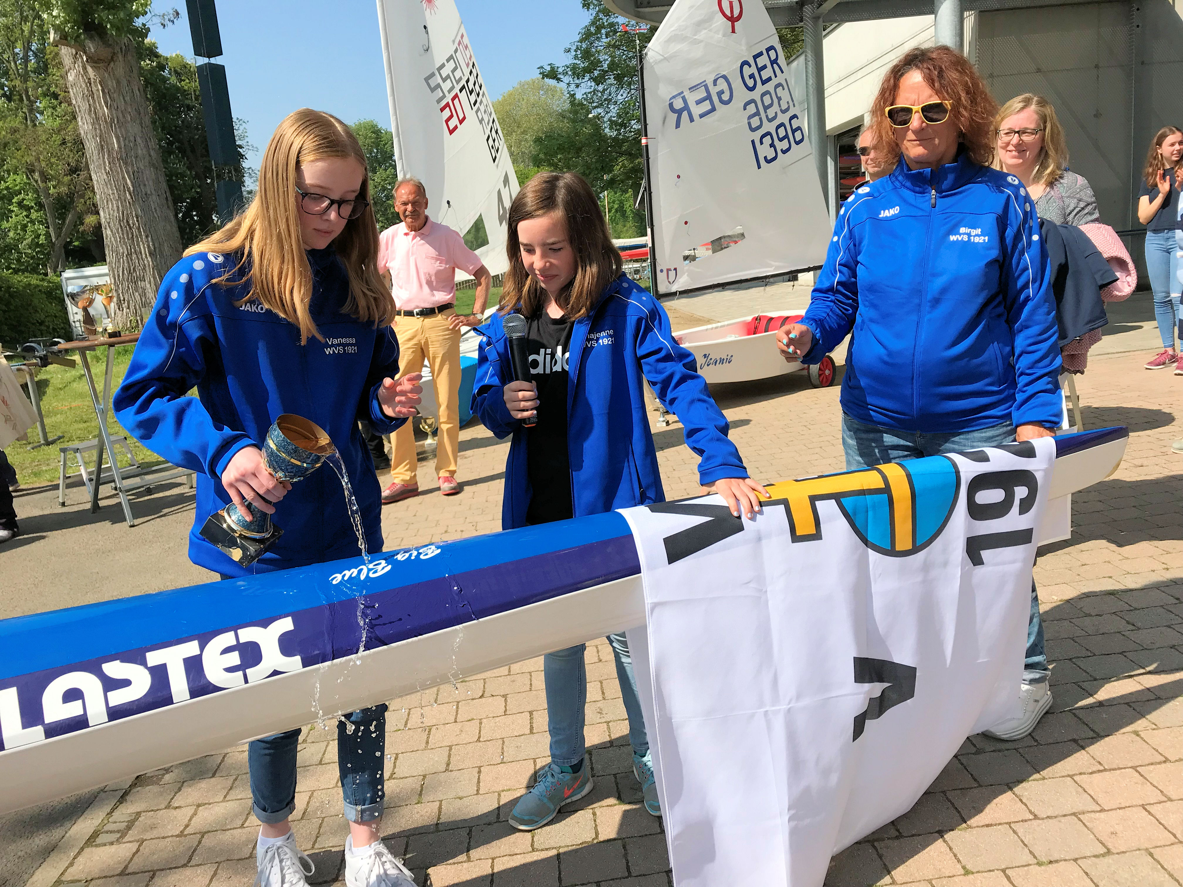 Der Fahnenmast vor dem WVS-Vereinshaus erstrahlt in neuen Glanz, ein mildes Mailüftchen weht durch Vereins- und Verbandsflaggen, im Biergarten (Vereinshock) — gerade wieder eröffnet — herrscht schon fröhlicher Betrieb, Paddlerjungs und ‑Mädchen in blauem WVS-Trainings-Outfit wuseln aufgeregt um blitzblank polierte Rennkajaks, daneben eine Jolle und ein Opti mit ihren Taufpaten in Wartestellung, die Drachenbootler haben sich sortiert und holen ihre langen Boote: Mittwoch. 1. Mai 2019, 10:45 Uhr, der Countdown zur Saisoneröffnung und Bootstaufe 2019 beginnt.