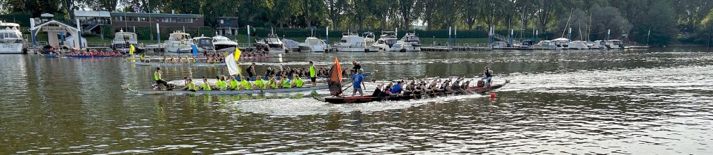 Die Staffelläufe waren eine ganz besondere Herausforderung. Hier kam es auf die kurze Distanz von 100-Metern nicht nur auf Tempo, sondern auch auf perfekte Koordination an. Pro Lauf starteten 6 Boote in 3 Teams. Die Zusammensetzung der Teams ergab sich aus der Rangfolge der Rennen vom Vormittag. Je eine Hälfte wartete gespannt nahe dem Steg, bis die Drachenköpfe der gegenüber starteten Boote aneinander vorbeigefahren waren – erst dann durfte das nächste Boot ins Rennen starten.