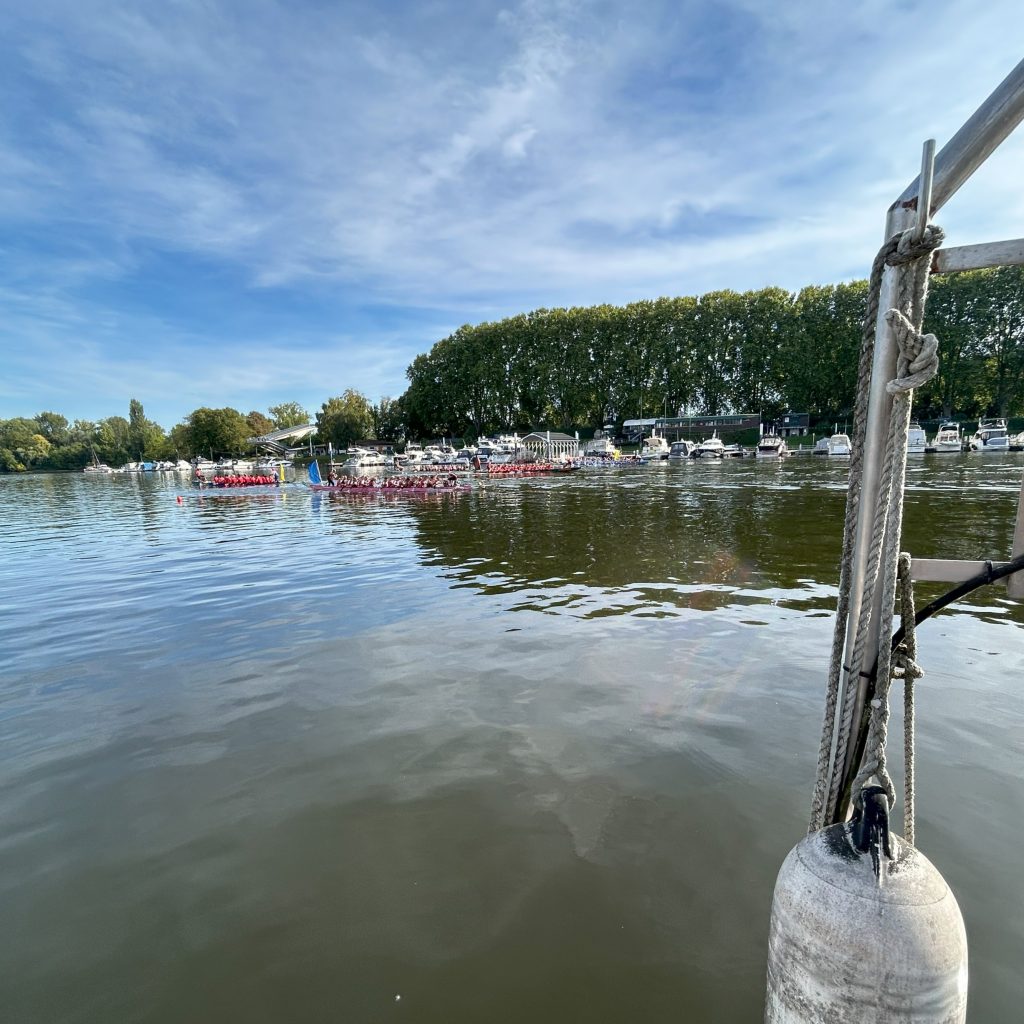 Harte Arbeit und viel Schweiß auch für die vielen Helferinnen und Helfer, die seit dem Morgen schon aktiv am Würstchenstand oder mit dem Wassersaugegerät auf dem Paddelsteg aktiv sind (da leuchtet viel Pink …) und ein tolles Spaktakel für die Zuschauer am Uferweg. Apropos Zuschauer: Nichts geht mehr bei diesem herrlichen Ausflugswetter an den Zufahrten Richtung Hafen (und im Rheingau). Und während sich die Regatta dem Finale nähert, lässt die Polizei draußen mindestens ein falsch geparktes Auto abschleppen.