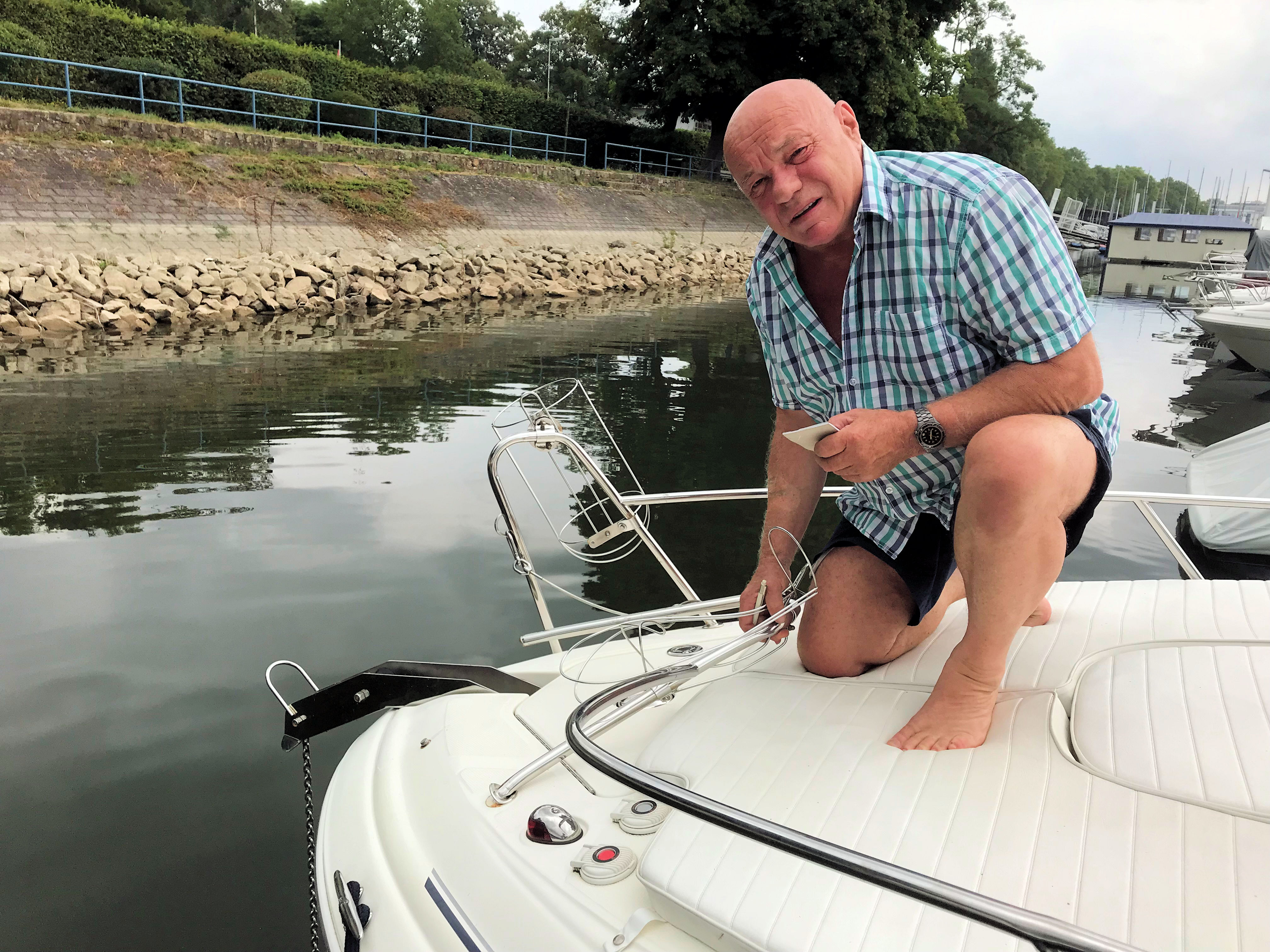 Mar­tin Buhl, Kfz- und Bootssachver­ständi­ger und Steg-1-Anlieger bei Schadens­be­gutach­tung auf dem ger­ammten Boot