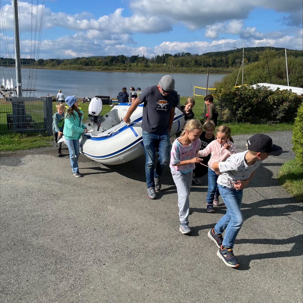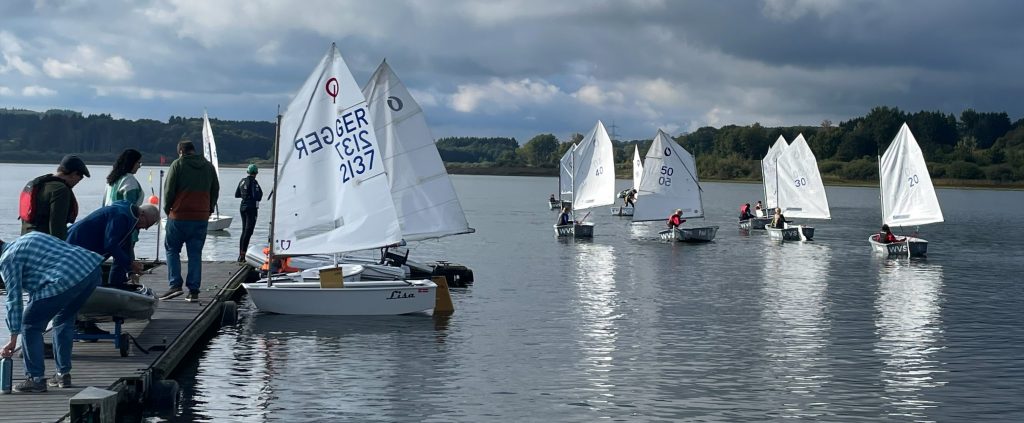 Unter der Anleitung ihres Train­ers nutzten die Kinder die Zeit am Sam­stag inten­siv zur Vor­bere­itung auf die anste­hende Prü­fung. Vor­mit­tags übten sie für die the­o­retis­che Prü­fung und wieder­holten noch ein­mal die wichtig­sten Knoten, da das Wet­ter anfangs noch nicht so ganz mit­spielte und es reg­nete. Nach­mit­tags kon­nten die Nach­wuchssegler schließlich mit ihren Booten aufs Wass­er. Dort fuhren die Kinder unter anderem ihren allerersten Regat­ta-Start! Der Prüfer Ralf Hoff­mann war eben­falls schon am Sam­stag vor Ort und warf dabei schon einen ersten Blick auf das Kön­nen der jun­gen Seg­lerin­nen und Segler.