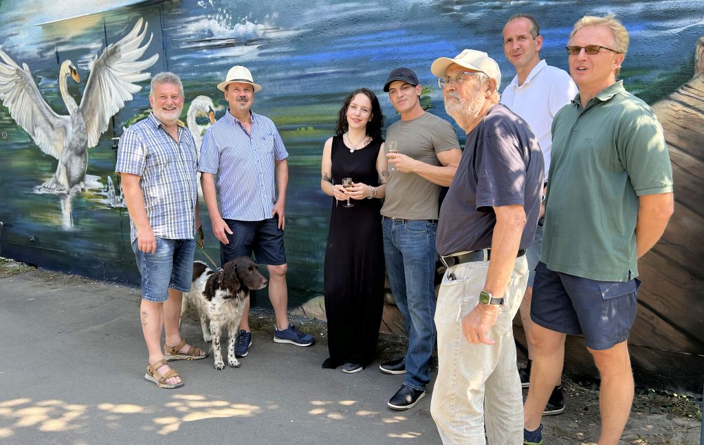 Grup­pen­bild mit zwei Schwä­nen und Hund (von links): Schier­steins Ortsvorste­her Urban Egert, WVS-Vorstände Ralf Hös­sel, Fran­jo Schohl, Alexan­der Wüst, René Schnei­der­höhn und in der Mitte die Kün­stler Juli­et Mur­phy und Sean Grif­fin bei der feier­lichen Ein­wei­hung des Ziel­turm-Gemäldes im West­en des Schier­stein­er Hafens