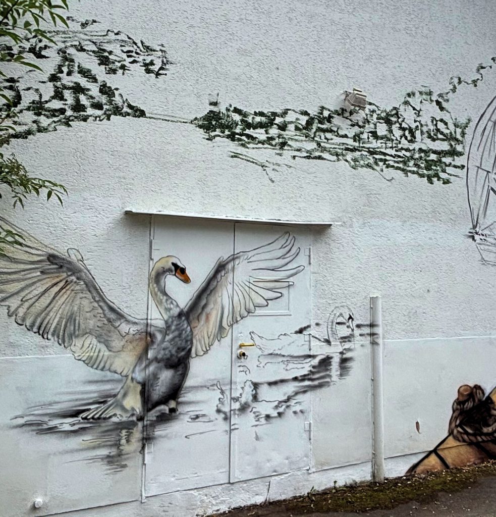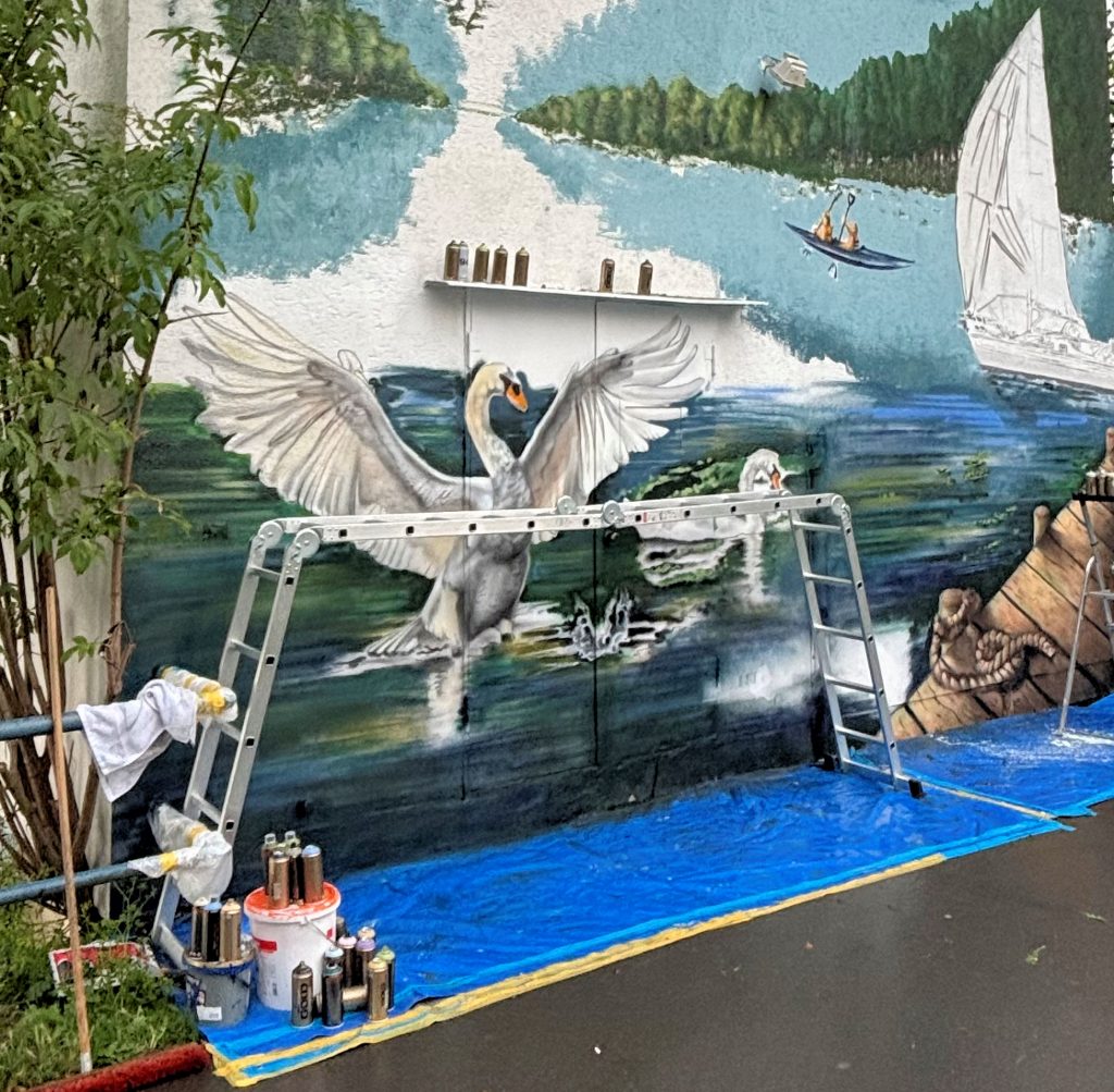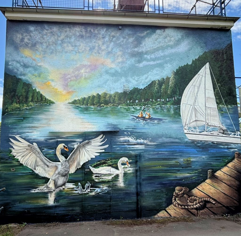 Und für Kun­st am Ziel­turm ern­tete der WVS und das Kün­stler-Paar bei der feier­lichen Ein­wei­hung am Sam­stag (16.08.) viel Lob. Urban Egert, Schier­stein­er Ortsvorste­her: “Sehr schön, ein Schmuck­stück für Schier­stein!” Ralf Hös­sel, WVS-Vor­stand, stimmte zu: “Super gelun­gen”. Auss­chließlich pos­i­tiv­en Zus­pruch ern­teten die bei­den Kün­stler auch während ihrer Arbeit von Pas­san­ten, die die ver­schiede­nen Phasen bis zur Fer­tig­stel­lung des Gemäldes am Ufer­weg mitver­fol­gen kon­nten. Dabei, beobachtete Urban Egert, mussten die Spaziergänger allerd­ings erst ein­mal ein paar Schritte zur Seite gehen, um das Bild mit gebühren­dem Abstand in sein­er vollen Größe sprich: Höhe, betra­cht­en zu können.