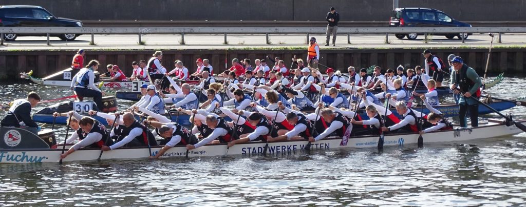 Das gesamte Ren­nen haben wir mit dem Wit­ten­er Drachen­boot hart und fair gekämpft (wir waren qua­si untrennbar) und haben gemein­sam andere Boote über­holt, Das macht Spaß und hat das Adren­a­lin hoch gehalten!