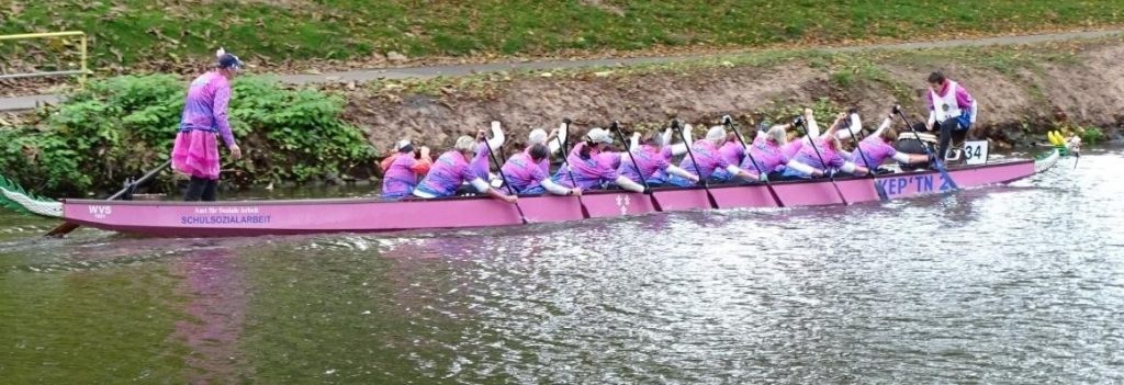 Am 18. Okto­ber war es wieder soweit – unter Affengeschrei aus den Laut­sprech­ern am Ufer ertönte der Start und nach­dem sich das Feld der reg­ulären Drachen­boot­teams auf eine 11 km Strecke gemacht hat, fol­gten die Teams der Pink Paddler.