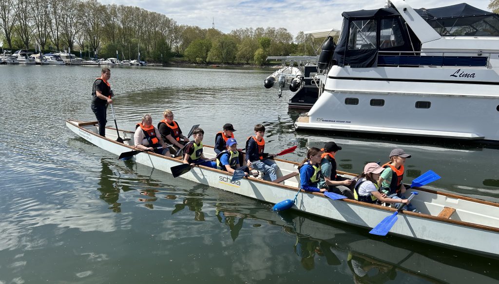 Ferienkinder beim WVS im Rah­men der Ferien­be­treu­ung des Amtes für Soziale Arbeit in der Woche vor Ostern. Ein Beobachter: “Wenn sie im Drachen­boot auf dem Wass­er sind, wird’s ruhig auf der Wiese.”