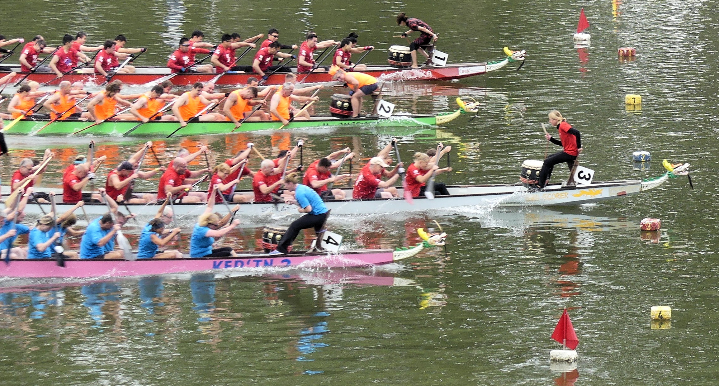 Die Geräuschkulisse im Hafen übertönte auch den Kirmeslärm beim Hafenfest: Das rhythmische Trommeln auf den Drachenbooten, die Lautsprecherstimme des Moderators, die Anfeuerungsrufe der knapp 300 Sportlerinnen und Sportler aus der Region — vom Start um 9 Uhr bis zur Siegerehrung am Nachmittag gehörte der Hafen den Drachenbooten. Spannend war’s. Nicht nur für die Sportlerinnen und Sportler selbst, sondern für jede Menge Zuschauer am Ufer.