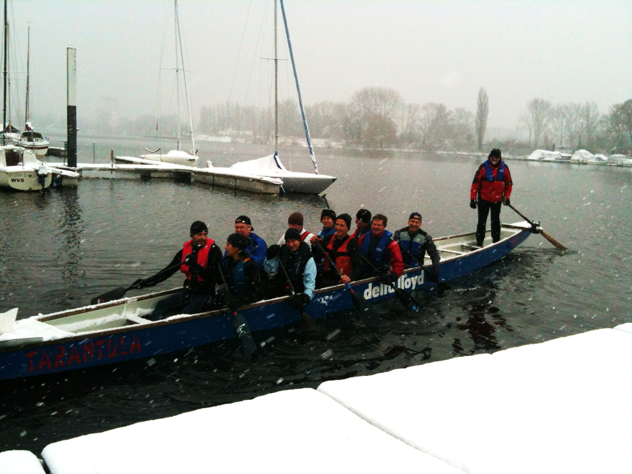 .…..10 Rhein­gauner und Steuer­mann Gün­ter gehen auf die win­ter­liche Pad­del­tour, um ca. 75 Minuten den inner­lichen Schweine­hund zu über­winden und gle­ich­falls die win­ter­liche Atmo­sphäre des nahe­liegen­den Rhein­gaus vom Wass­er aus zu genießen.